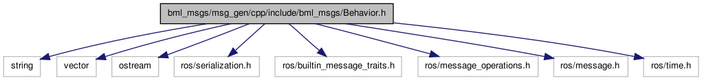 bml_msgs/msg_gen/cpp/include/bml_msgs/Behavior.h File Reference#include <string>#include <vector>#include <ostream>#include "ros/serialization.h"#include "ros/builtin_message_traits.h"#include "ros/message_operations.h"#include "ros/message.h"#include "ros/time.h"